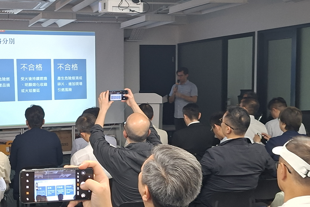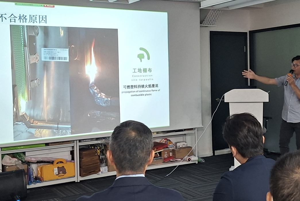 During the seminar, our expert demonstrated why rigorous laboratory testing is essential for site safety. A key focus was debunking informal “on-site” methods, such as using a common lighter to test fire resistance, which fails to provide an accurate assessment of a material’s true performance. By presenting videos of professionally conducted testing procedures alongside real-world case studies, we highlighted the importance of standardized verification in protecting lives and infrastructure.